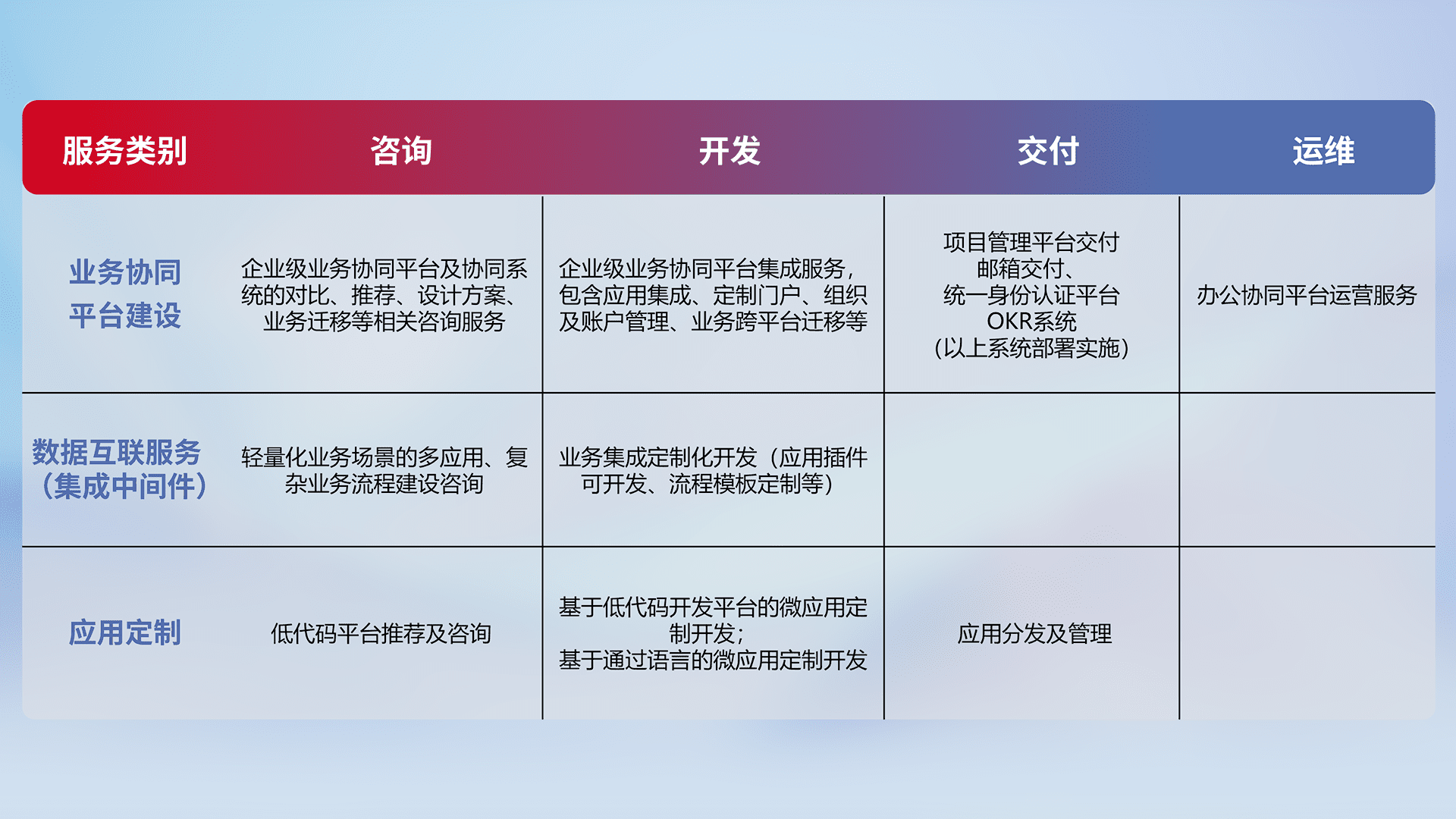 针对钉钉、、、企微、、IDaas等平台级产品提供产品的规划、、、、方案、、、、交付、、、定制化开发等服务,,,实现如统一协同办公、、、、智能客户服务、、、混合会议管理、、、、智能数据查询、、等业务场景,,,,实现数字化转型。。。